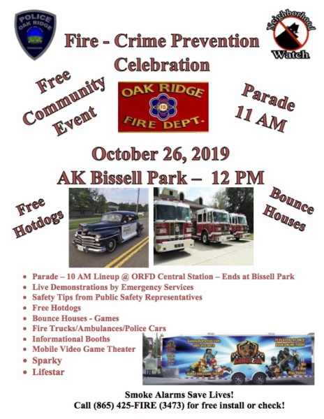 The Oak Ridge Fire and Police Departments, in partnership with the Oak Ridge Neighborhood Watch Program, will hold this year’s Fire and Crime Prevention Celebration on Saturday, October 26.