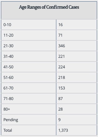 There are more than 200 cases each in the next three age groups: 31-40 years old (221 cases), 41-50 (224), and 51-60 (218). The four age groups, from 21 to 60 years old, account for 1,009 cases, or about 73 percent of the state’s total.