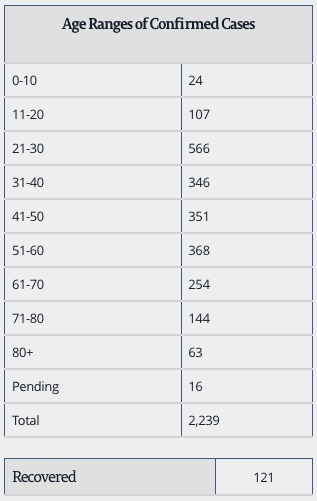 Demographically, the largest number of cases is still in patients who are 21 to 30 years old. There are 566 cases, or about 25 percent of the total, in that age group.