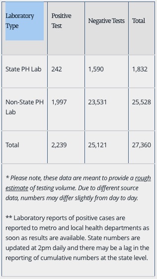 There have been a total of 27,360 COVID-19 tests across the state. The 2,239 positive tests are about 8.2 percent of the total tests, and the 25,121 negative tests are about 91.8 percent of the total.