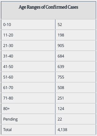 Demographically, the largest number of cases was still in patients who are 21 to 30 years old. There were 905 cases, or about 21.9 percent of the total, in that age group.