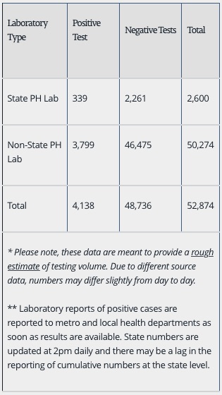 There have been 52,874 COVID-19 tests in Tennessee at the state public health laboratory and at other labs. The total number of cases in Tennessee includes both confirmed cases and cases that are presumed to be positive.
