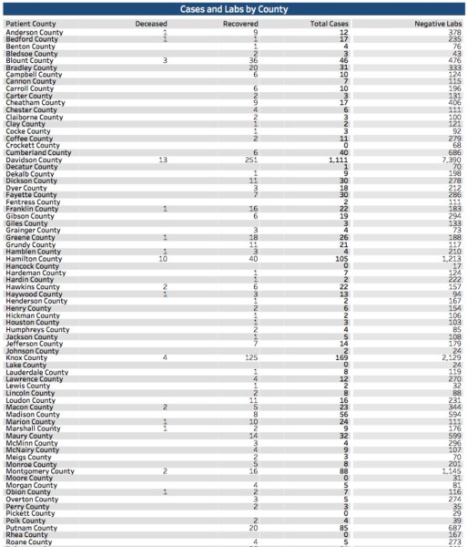 Four deaths have been reported in Knox County, which includes Knoxville in East Tennessee. Knox County has had 165 cases, with 125 of those recovered on Saturday.