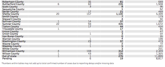 Seven Nashville-area counties had 2,326 total cases on Saturday: Cheatham (17), Davidson (1,111), Robertson (81), Rutherford (235), Sumner (435), Williamson (312), and Wilson (135). That was about 45 percent of the state’s total.