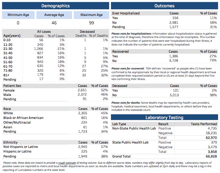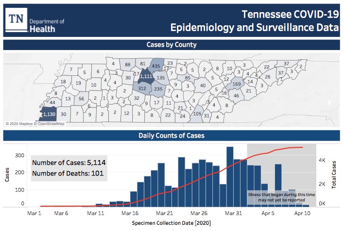 The Tennessee Department of Health reported 5,114 cases and 101 deaths. The state health department publishes the state case totals at 2 p.m. Central time each day.