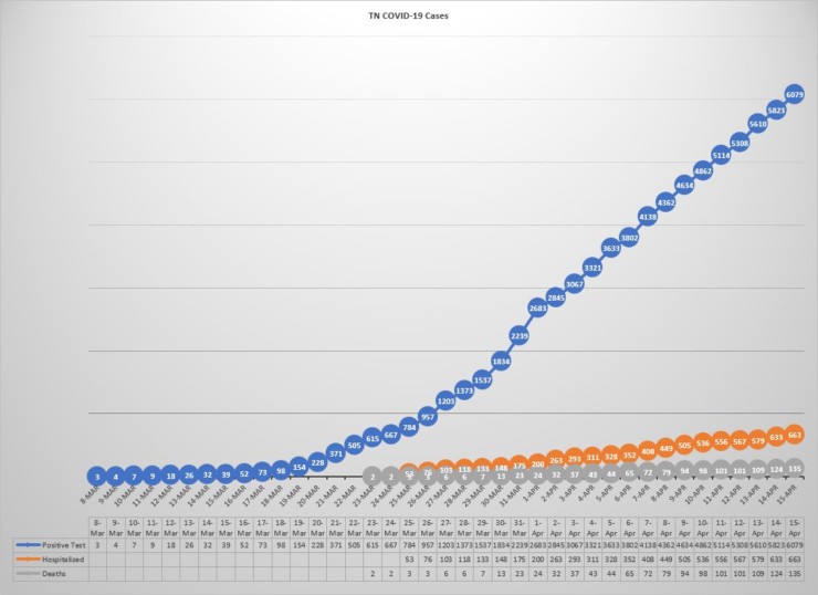 In the most recent update, from Wednesday, the Tennessee Department of Health reported 6,079 COVID-19 cases in Tennessee with 135 deaths. There have been 663 hospitalizations and 2,196 recoveries.