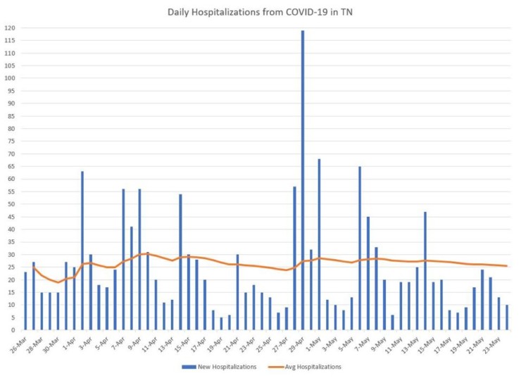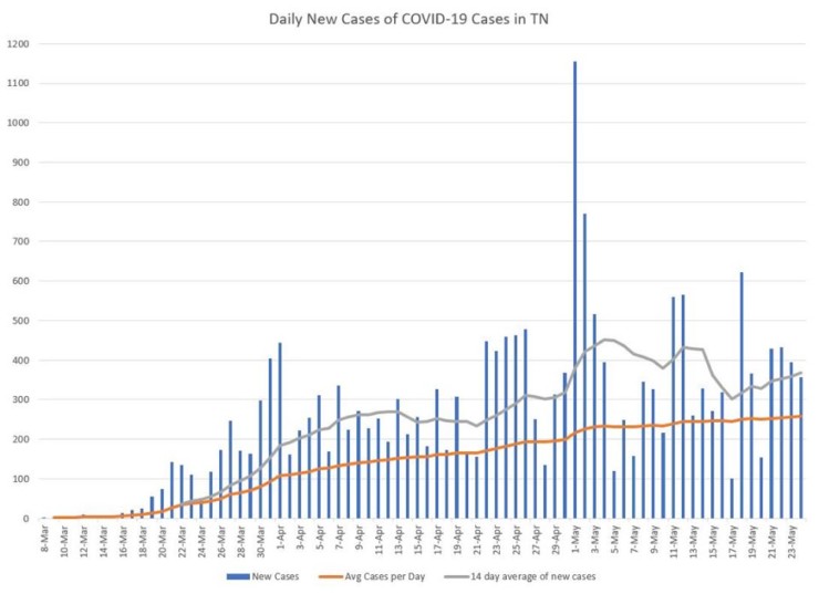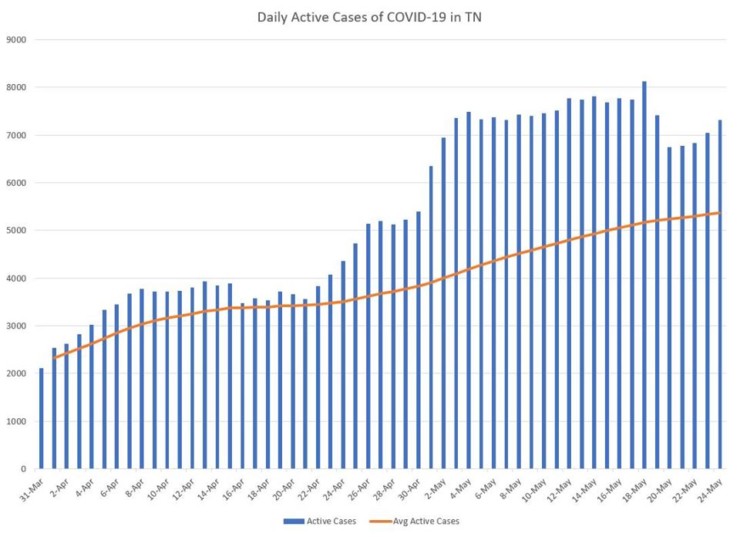 The seven-day average of the percentage increase in new cases in Tennessee had dropped from 2.41 percent on May 12 to 1.79 percent on May 20, but it climbed back up to 2.11 percent on Sunday.