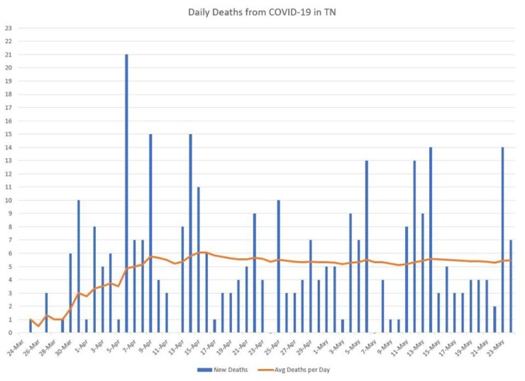 The doubling time in the number of cases—the amount of time it took to go from 10,000 cases to 20,000 cases—was 26 days. For deaths, it was about 32 days (166 deaths on April 22 and 336 on Sunday). That’s a longer doubling time than reported earlier in the pandemic in Tennessee.
