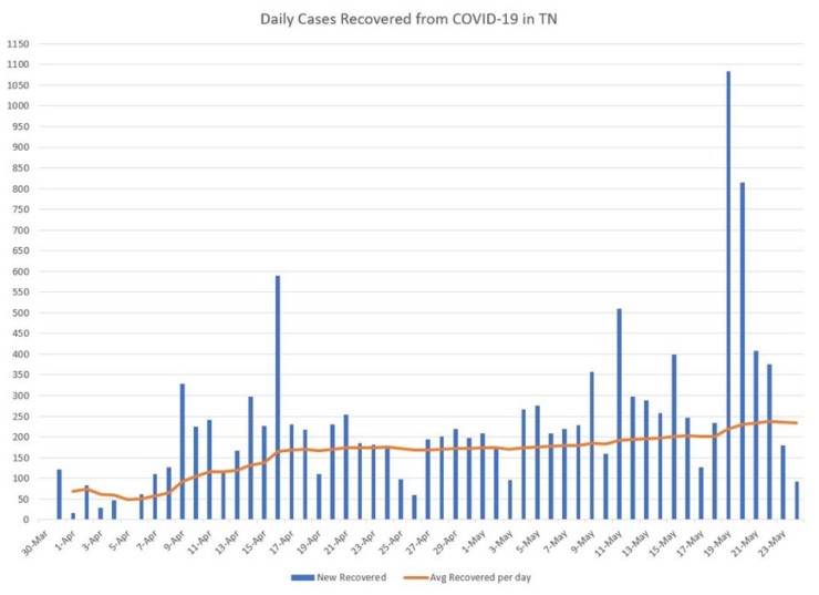 About 64 percent of COVID-19 patients in Tennessee had recovered as of Sunday (12,837 of 20,145 cases), according to the Tennessee Department of Health. The state health department said recovered patients are those who have been confirmed to not have symptoms and have completed their required isolation period—or it’s been at least 21 days since they had their first test confirming their illness.