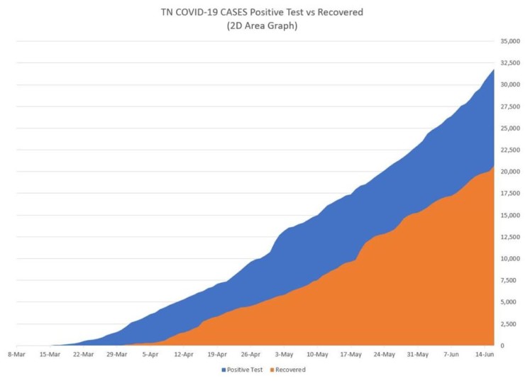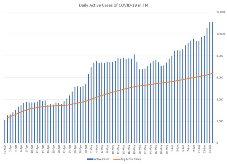 The number of active cases in Tennessee has been increasing. Comparing confirmed cases to recoveries, it passed 10,000 on Sunday.