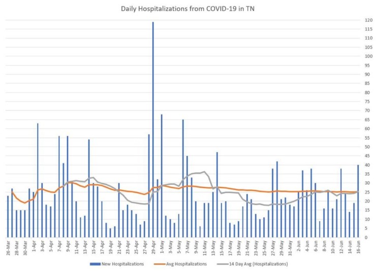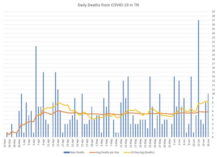 The seven-day average of the percentage increase in new cases in Tennessee ranged between 1.67 percent and 2.09 percent in the 10-day period between June 6 and June 16.