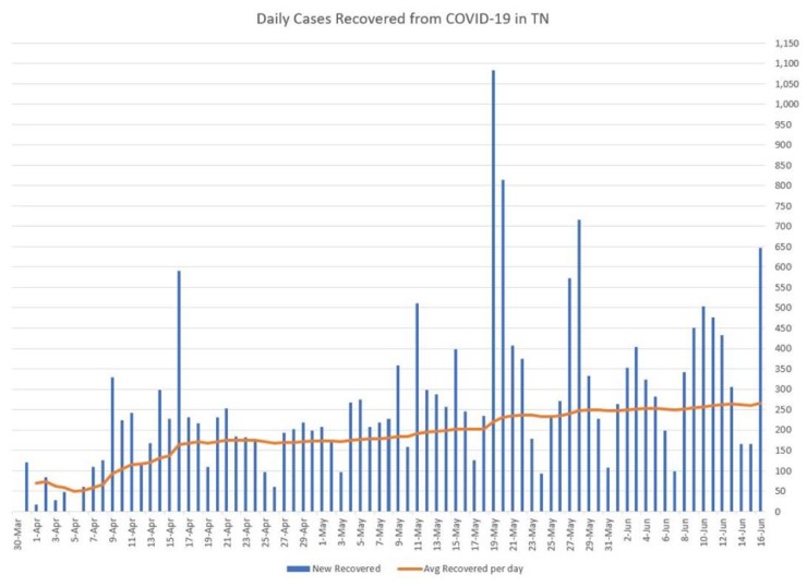 The highest case totals continue to be around Memphis and Nashville. Shelby County (the Memphis area) reported 7,104 cases (confirmed and probable) and Davidson County (the Nashville area) reported 7,016 cases.