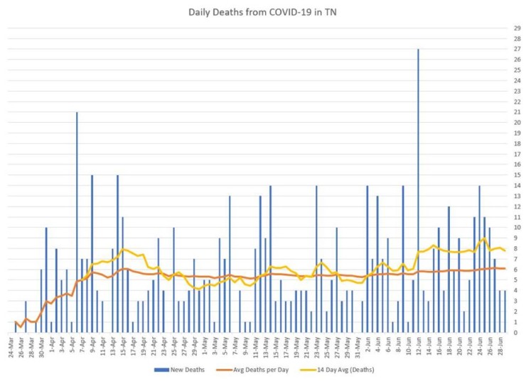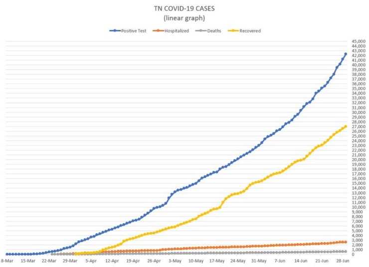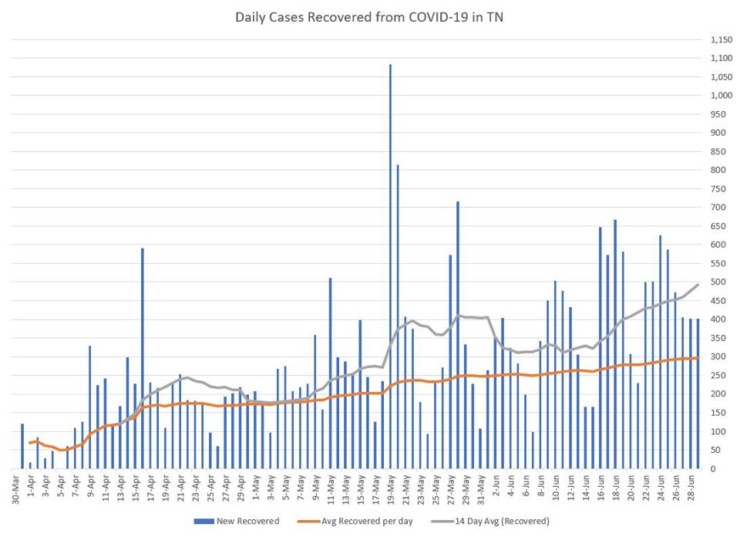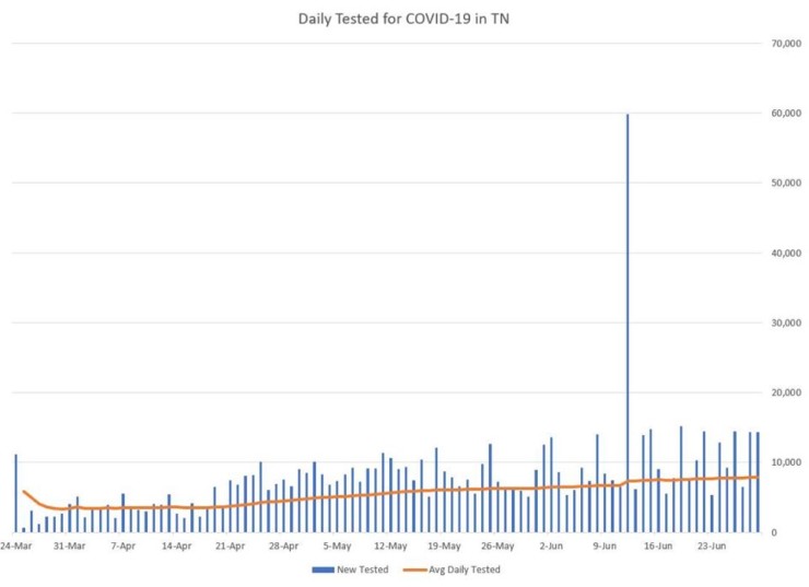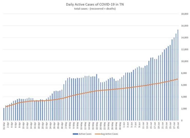 The Tennessee Department of Health did not report COVID-19 data on Sunday because of an unplanned shutdown of the state system. But the two-day numbers released Monday showed an average of more than 1,000 new cases per day for Sunday and Monday.