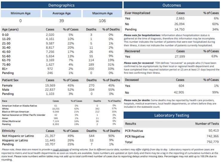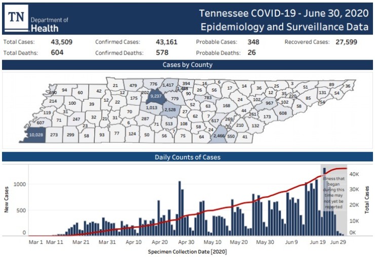 Statewide, there were 43,509 COVID-19 cases on Tuesday, with 604 deaths. There have been 27,599 recoveries and 2,665 hospitalizations, according to the Tennessee Department of Health.