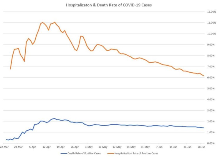 While the total number of current hospitalizations has risen, the statewide hospitalization and death rates have fallen, with the hospitalization rate declining faster than the death rate. The hospitalization rate is now about 6.1 percent, and the death rate is roughly 1.4 percent.
