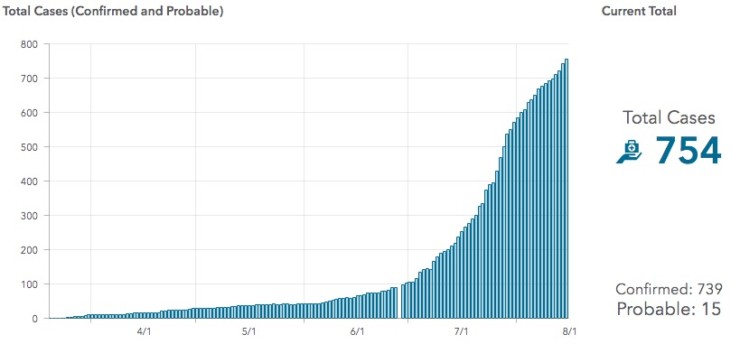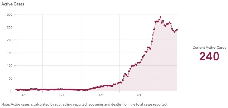 The number of active cases has dropped by about 50 in the past two weeks, from a peak of 289 on Sunday, August 2, to 242 on Sunday, August 16. Active cases are total cases minus recoveries and deaths.
