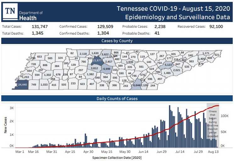 In Davidson County, 21,893 cases have been reported, an increase of close to 2,000 cases since August 7. In that county, 227 deaths have been reported. Davidson County includes Nashville in Middle Tennessee.