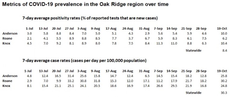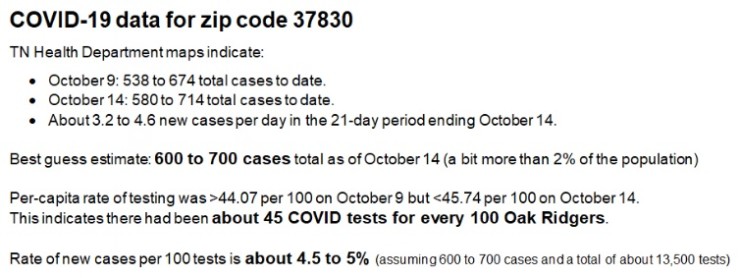 She said the data indicate there have been about 45 COVID tests for every 100 Oak Ridgers, and the rate of new cases per 100 tests is about 4.5 to 5 percent.