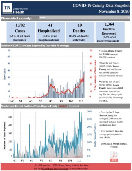 A total of 1,702 COVID-19 cases have been reported in Roane County, with 10 deaths and 41 hospitalizations. The 14-day new case average was 28.6 on Sunday, up from 18.0 in the previous two-week period.