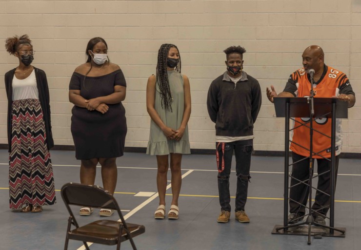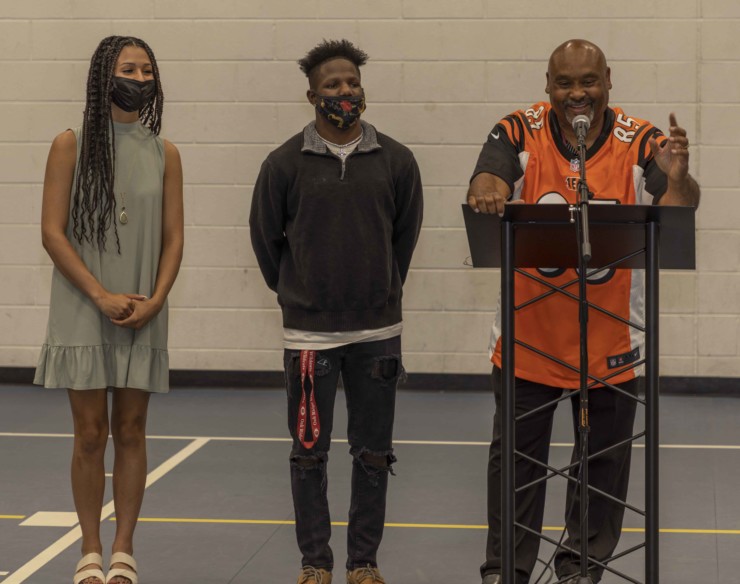 Scholarship recipients Faythe Summers and Jaylen Heyward listen as John Spratling, right, of the Scarboro Alumni Association addresses the audience. (Photo courtesy CNS/Y-12)