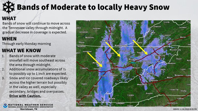 The NWS said snow bands with moderate snowfall will continue through midnight in northeast Tennessee and southwest Virginia, and a gradual decrease in snow is expected.