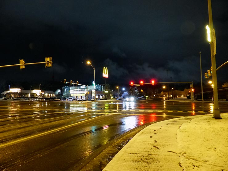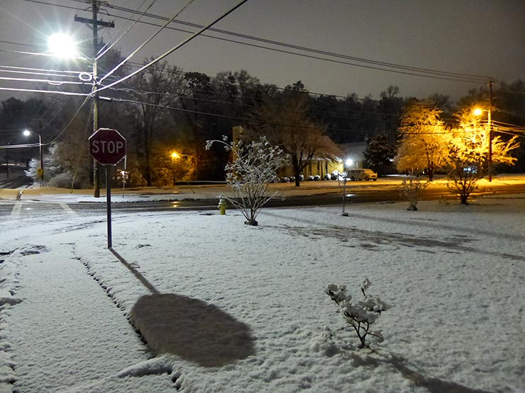 Some side streets were still snow covered at about 10 p.m. Sunday, but heavily traveled roads and main roads such as South Illinois Avenue were mostly clear except for some slush. That raised the possibility that some surfaces might freeze overnight with the low forecast around 26 degrees Fahrenheit.