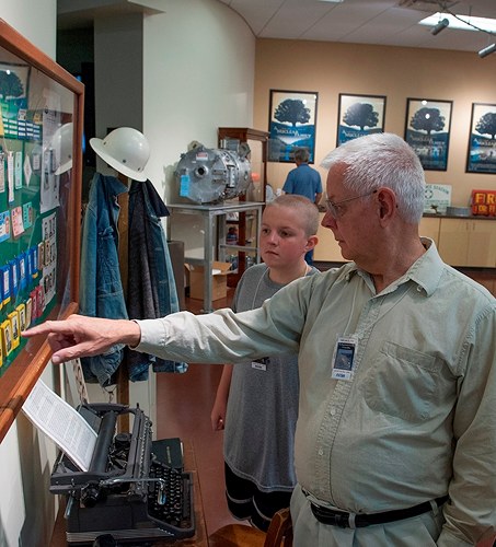 Former Y-12 employee James Spicer points out the various ID badges used at the site during its 70-year history to his grandson Matthew Sellers. Spicer and Sellers joined more than 480 visitors who toured Y-12 as part of this year’s Secret City Festival. (Photos by Scott Fraker)