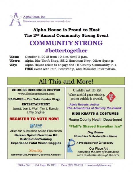 On Saturday, October 6, Alpha House will host its Second Annual Community Strong Day for the tri-county area of Anderson, Morgan, and Roane counties from 10 a.m. until 2 p.m. at the Alpha Bitz Thrift Shop in Oliver Springs.