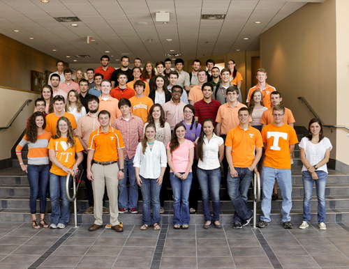 University of Tennessee engineering students who are taking part in summer internships at Oak Ridge National Laboratory, more than 60 in all, gather at ORNL. (Photo courtesy UT)