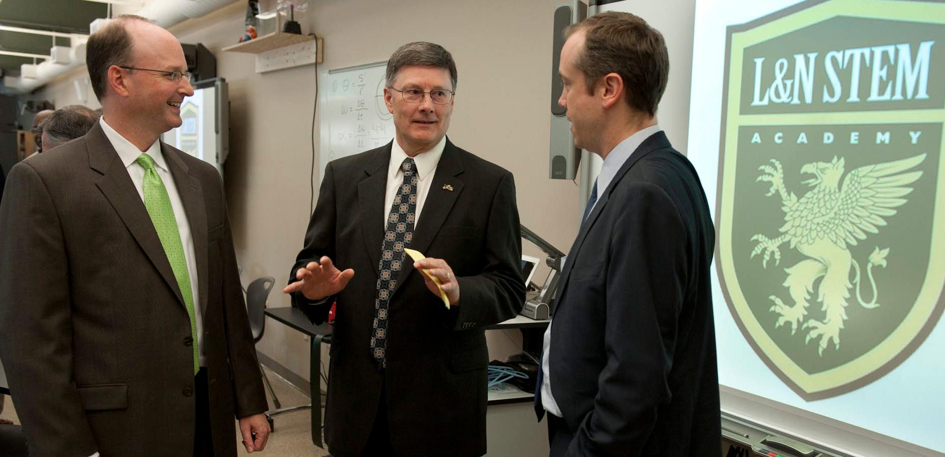 B&W Y-12 Senior Vice President and Deputy General Manager Bill Klemm, center, speaks to Knox County School Superintendent Jim McIntyre, left, and Tennessee Commissioner of Education Kevin Huffman at a ribbon-cutting ceremony on April 17 at the L&N STEM Academy in downtown Knoxville.