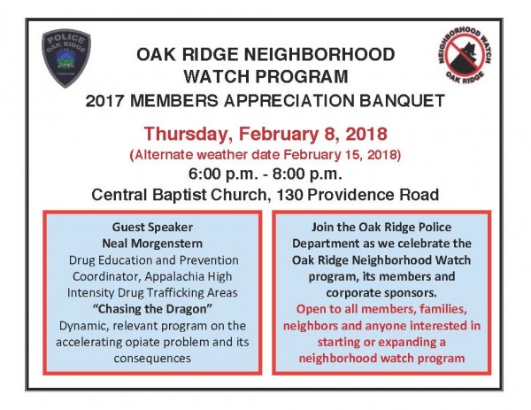 The Oak Ridge Neighborhood Watch Program has its annual appreciation banquet on Thursday, February 8.