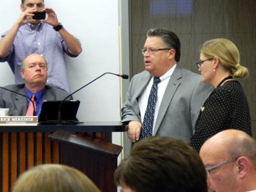 Anderson County Law Director Jay Yeager, left, the defendant in an ouster suit filed by a group of residents, is pictured with Lynn Byrge, one of the petitioners, during a Monday morning Anderson County Commission meeting.