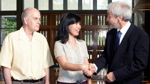 Duke University’s Robert Calderbank, left, and Haiyun Gao discuss a graduate education agreement with Ian Anderson of Oak Ridge National Laboratory. (Photo courtesy of Duke University)