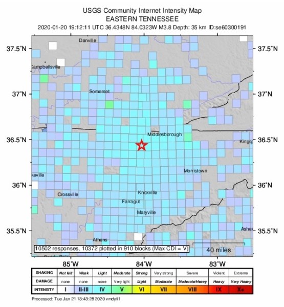 No damage was reported on the Oak Ridge Reservation after a 3.8 magnitude earthquake was reported about 30 miles northeast of Oak Ridge on Monday, January 20.