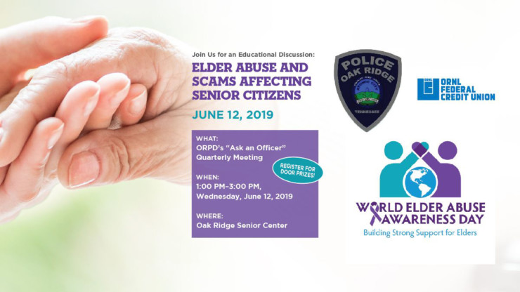 The Oak Ridge Police Department, in partnership with ORNL Federal Credit Union, will host its quarterly “Ask an Officer” meeting at Oak Ridge Senior Center on Wednesday, June 12, from 1 p.m. to 3 p.m. The focus will be on elder abuse in honor of World Elder Abuse Awareness Day happening later in the week, a press release said.