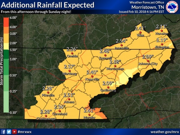 The National Weather Service in Morristown said an additional one to two inches of rain is possible through 8 p.m. Sunday.