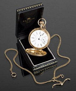 Among items will be a Rolex watch that actress, singer, and director Barbara Streisand presented to a former boyfriend, inscribed with a quote from her song “Evergreen,” and a gold hot dog that Robert Goulet had designed for his aunt, who offered him $10 for hot dogs when he was a struggling actor. An aquamarine and diamond ring that belonged to actress Tallulah Bankhead and a 14 karat gold pocket watch that was the guitarist Les Paul’s, with an inscription to Les, will also be among treasures at the show.