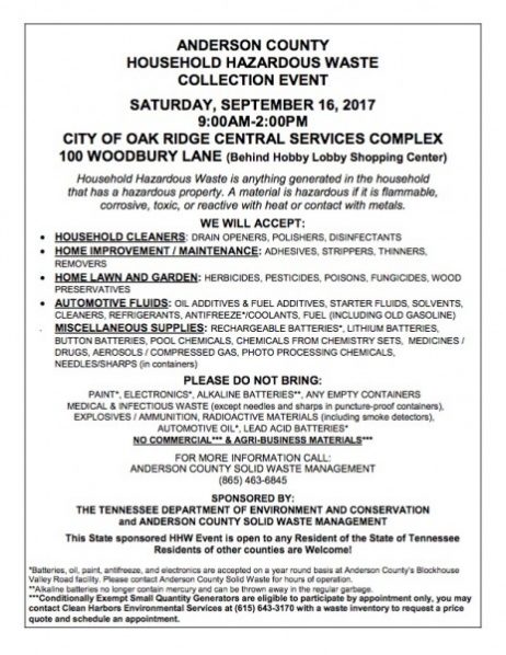 Tennesseans are encouraged to bring household hazardous waste – including cleaning fluids, pesticides, swimming pool chemicals, and more – to a designated drop-off location, a press release said. A person does not need to live in the county to participate.