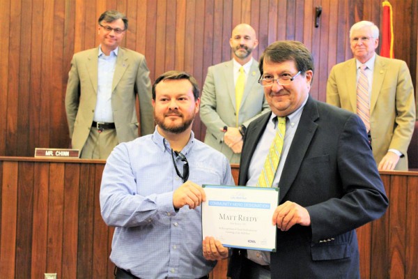 Matt Reedy, left, receives an official ICMA Community Hero certificate and letter from Oak Ridge City Manager Mark Watson, right. From left to right in background are Mayor Pro Tem Rick Chinn, Council member Jim Dodson, and Council member Kelly Callison. (Photo courtesy City of Oak Ridge)