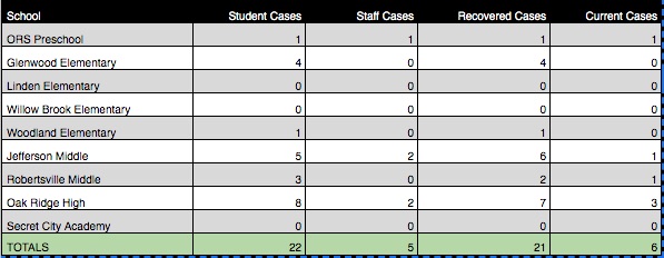 Twenty-eight cases of COVID-19 have been reported among students and staff members in Oak Ridge Schools this school year, and six of those are current cases, according to data published by the school system.