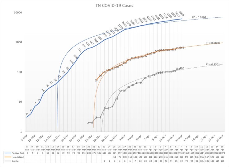 In the most recent update, from Wednesday, the Tennessee Department of Health reported 6,079 COVID-19 cases in Tennessee with 135 deaths. There have been 663 hospitalizations and 2,196 recoveries.