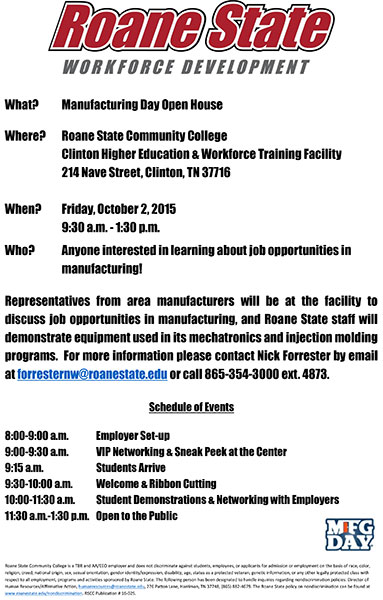 Roane State Community College will host an open house at its Clinton Higher Education and Workforce Training Facility as part of Manufacturing Day on Friday, October  2.
