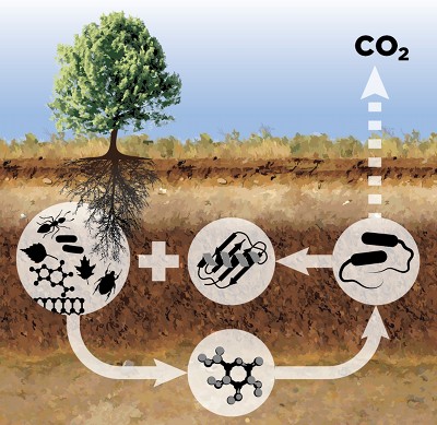 Oak Ridge National Laboratory’s new carbon cycling model could help scientists understand the role of soil in climate change by tracking the microbial processes that break down carbon-rich materials. (Graphic submitted by ORNL)