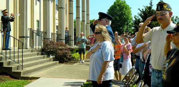 More than 150 people salute as 'Taps' is played during a Memorial Day ceremony in Clinton on Monday. At center is Amy Morris, mother of U.S. Army Staff Sgt. Daniel Morris, who died in Iraq in 2006.