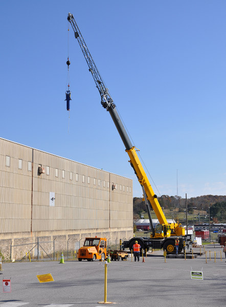 Ernie Gunter, left, and Michael Shirks watch as a NaF trip is lifted through the roof of K-27. (Submitted photos)