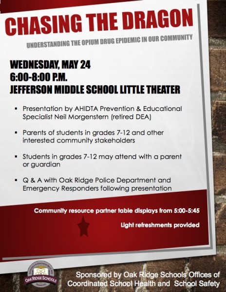 The presentation is titled “Chasing the Dragon: Understanding the Opium Drug Epidemic in Our Community.” It’s scheduled from 6-8 p.m. Wednesday, May 24, at the Jefferson Middle School Little Theater in Oak Ridge.