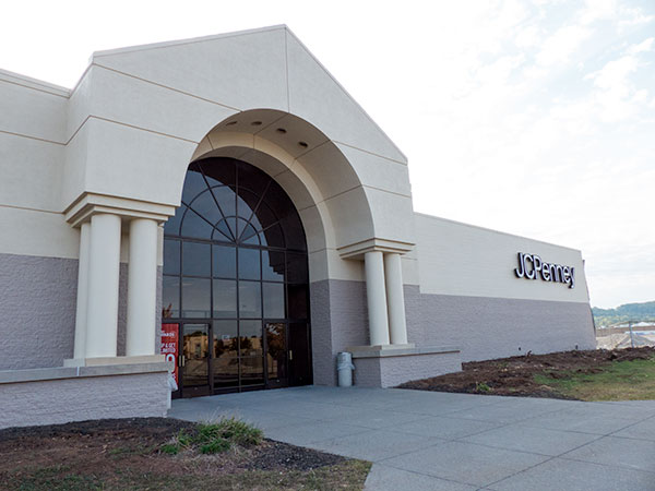 Eight new stores at Main Street Oak Ridge could be turned over to retailers by the end of June, a city consultant said Tuesday, May 2, 2017. Under construction above are the new Dick’s Sporting Goods and T.J. Maxx stores. These are the entrances closest to South Illinois Avenue. The U.S. Post Office is to the left, and Walmart is to the right. (Photo by John Huotari/Oak Ridge Today)
