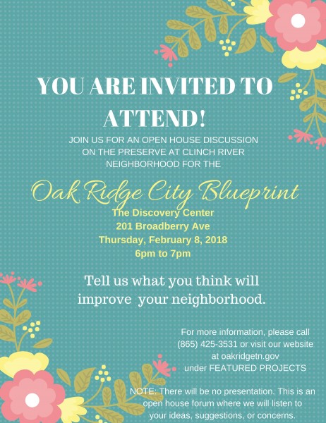 The Oak Ridge Community Development Department is continuing the Oak Ridge City Blueprint effort with a discussion focused on the Preserve at Clinch River neighborhood. An open house will be held between 6 p.m. and 7 p.m. on Thursday, February 8, at The Discovery Center on Broadberry Avenue.