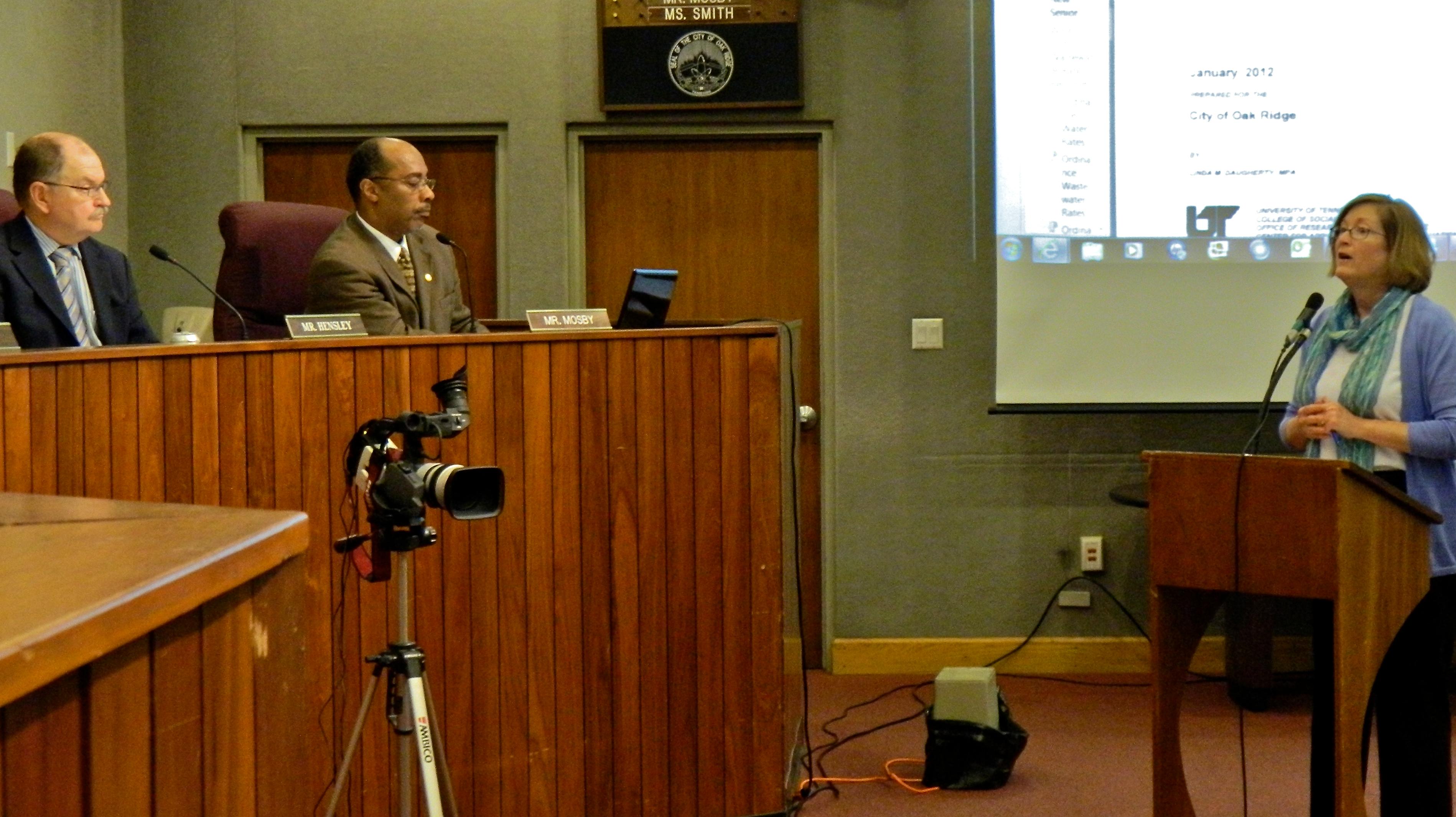 At Monday's City Council meeting, Linda Daugherty, right, of the University of Tennessee, presents survey results that suggest supporters of a new Oak Ridge Senior Center could outnumber opponents. Also pictured are Council members Charlie Hensley, left, and David Mosby.