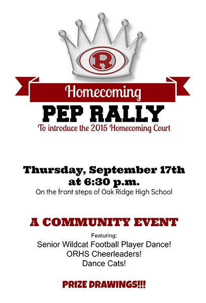 The pep rally starts at 6:30 p.m. Thursday, September 17, on the front steps of Oak Ridge High School. The 2015 Homecoming Court will be introduced.